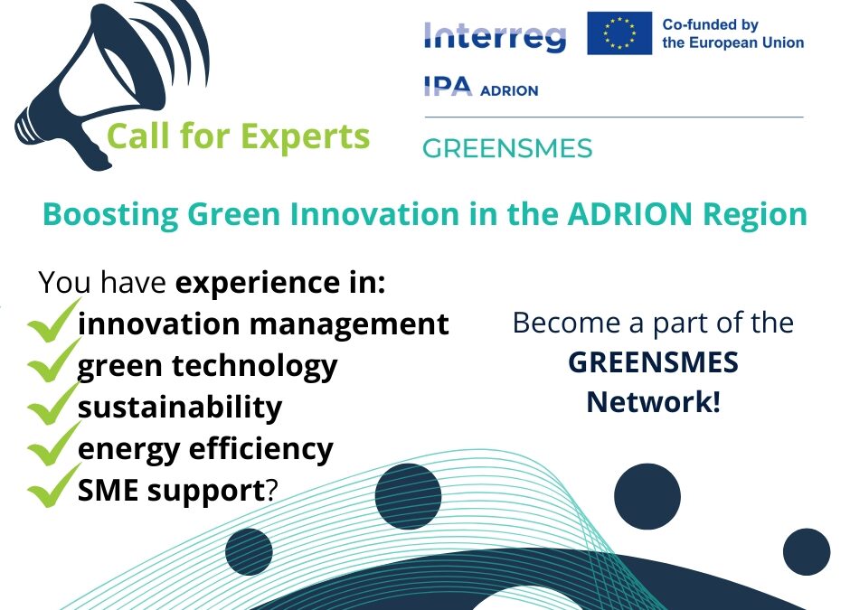 The GREENSMES project under the Interreg IPA ADRION 2021–2027 programme is seeking qualified professionals to join a Roster of Experts supporting green innovation and sustainable growth for SMEs across the IPA ADRION region.