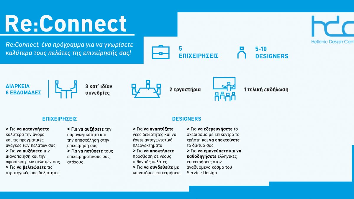 Το Re:Connect, είναι ένα νέο πιλοτικό πρόγραμμα για 5 επιχειρήσεις και 5-10 designers σε συνεργασία με εμπειρογνώμονες σε θέματα customer insights, user experience και product/service development, με στόχο τη δημιουργία δεξιοτήτων στρατηγικού σχεδιασμού, το οποίο παρέχεται δωρεάν από το Hellenic Design Centre.